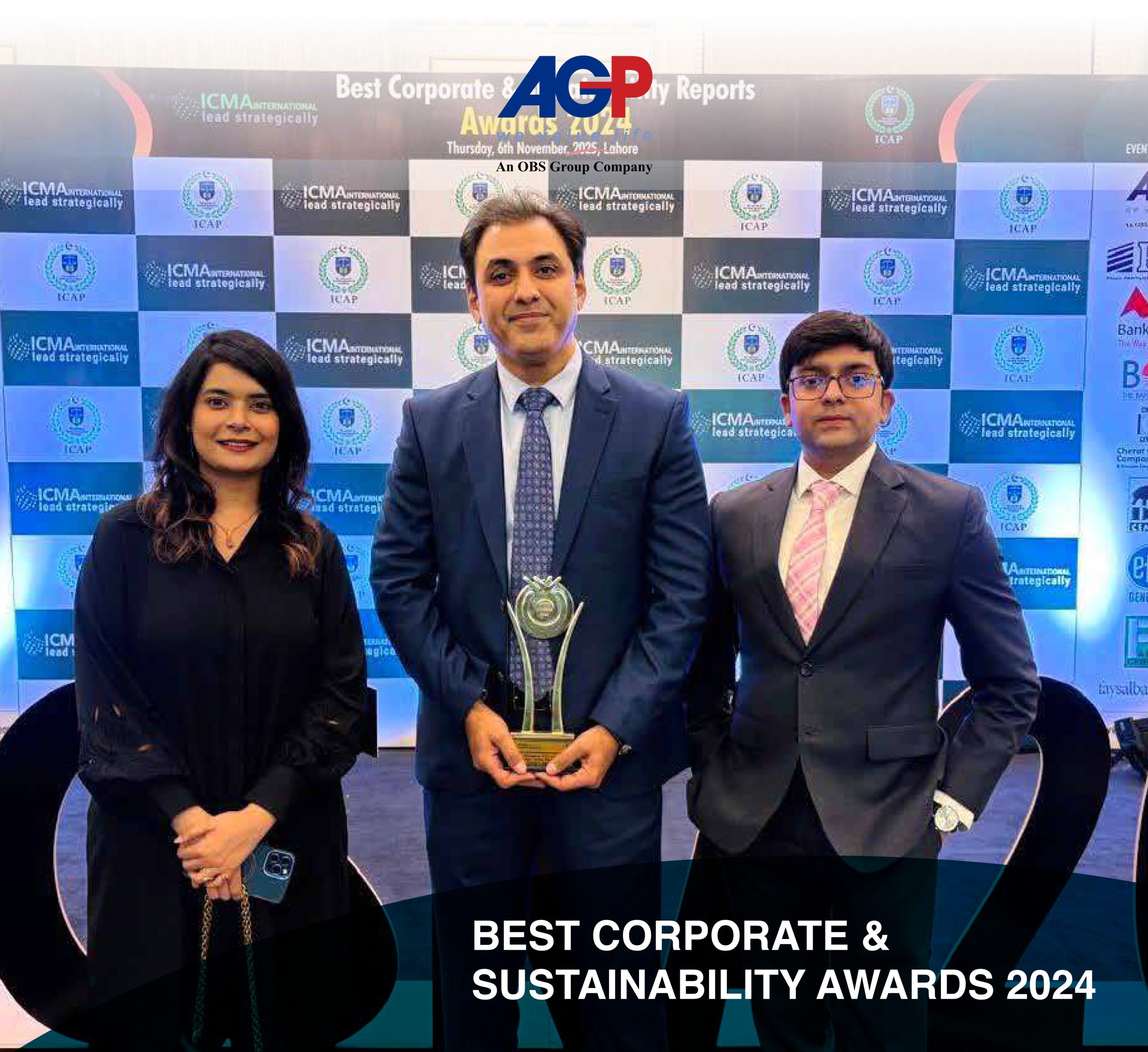 AGP Limited is proud to have secured 1st place in the ‘Pharmaceutical Category’ at the Best Corporate & Sustainability Reports (BCSR) Awards 2024 — marking our second consecutive year of excellence in corporate reporting. This year’s theme, “Innovate, Integrate, Elevate” perfectly aligns with AGP’s commitment to driving innovation, fostering collaboration and elevating the standards of corporate transparency and sustainability. Organized by the Institute of Chartered Accountants of Pakistan (ICAP) and the Institute of Cost and Management Accountants of Pakistan (ICMAP) , these awards celebrate excellence in corporate governance and sustainability reporting. This recognition stands as a testament to the dedication, innovation and teamwork of our people and reinforces AGP’s vision of leading with integrity, purpose and sustainable growth.